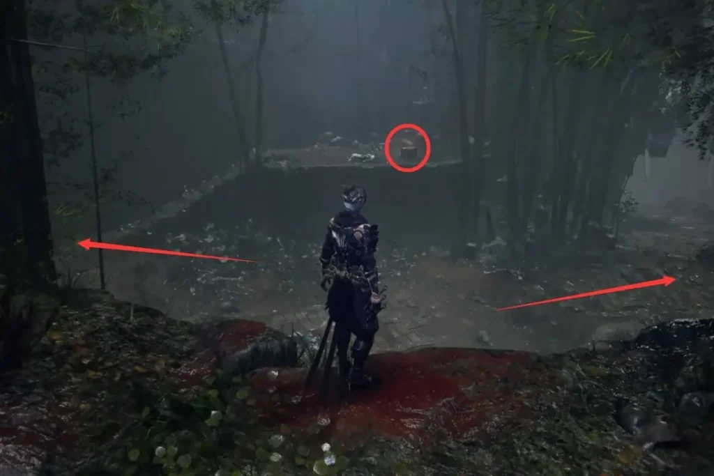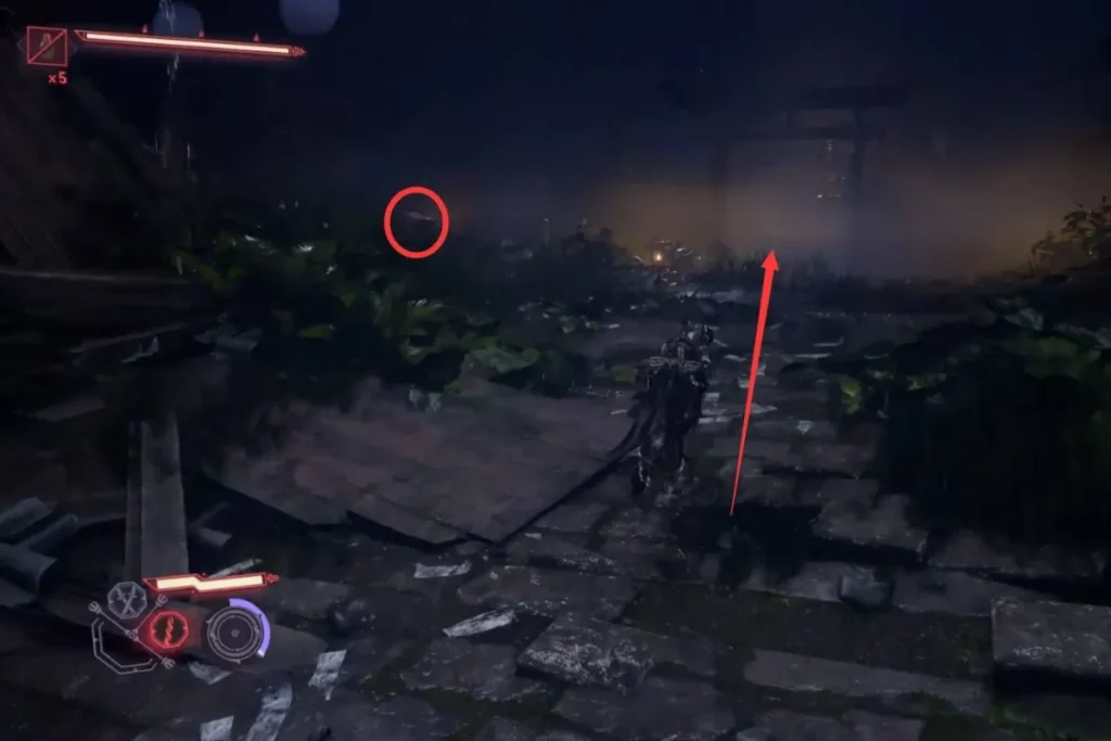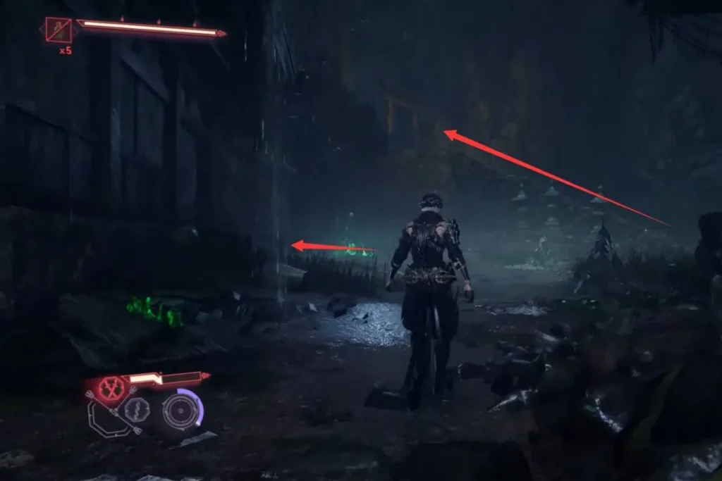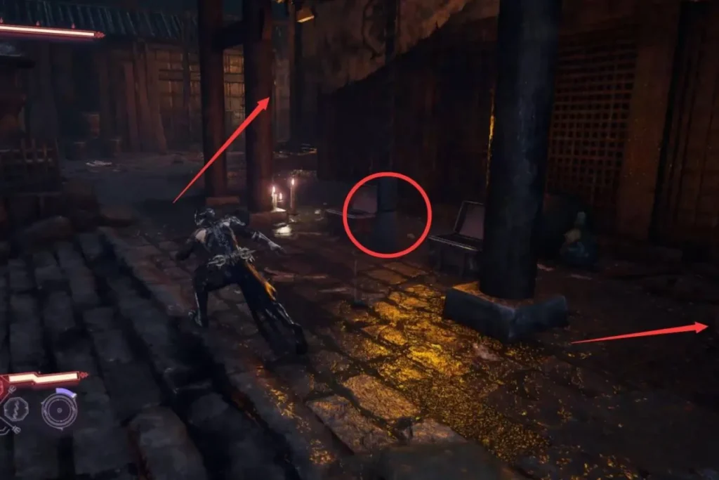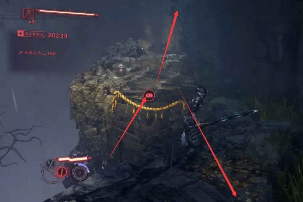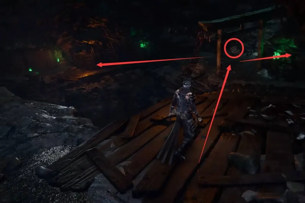 走上階梯後先不要用抓鉤往前,看向下方溝渠可以跳下去,底下有兩個寶箱以及一處【煉獄】可收集。