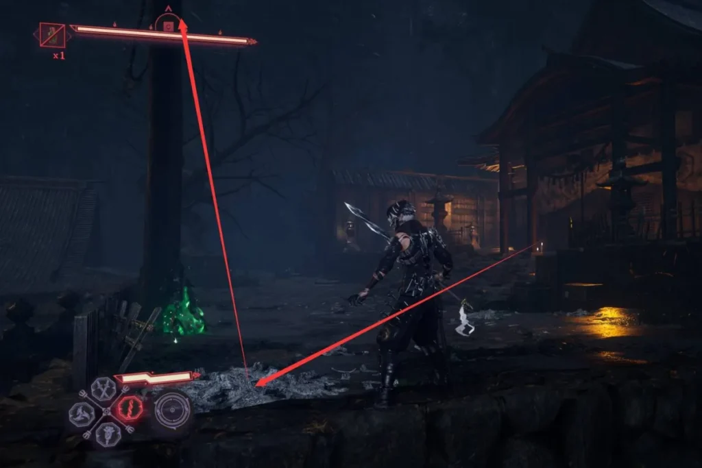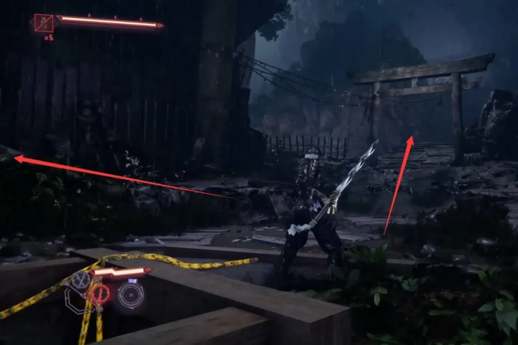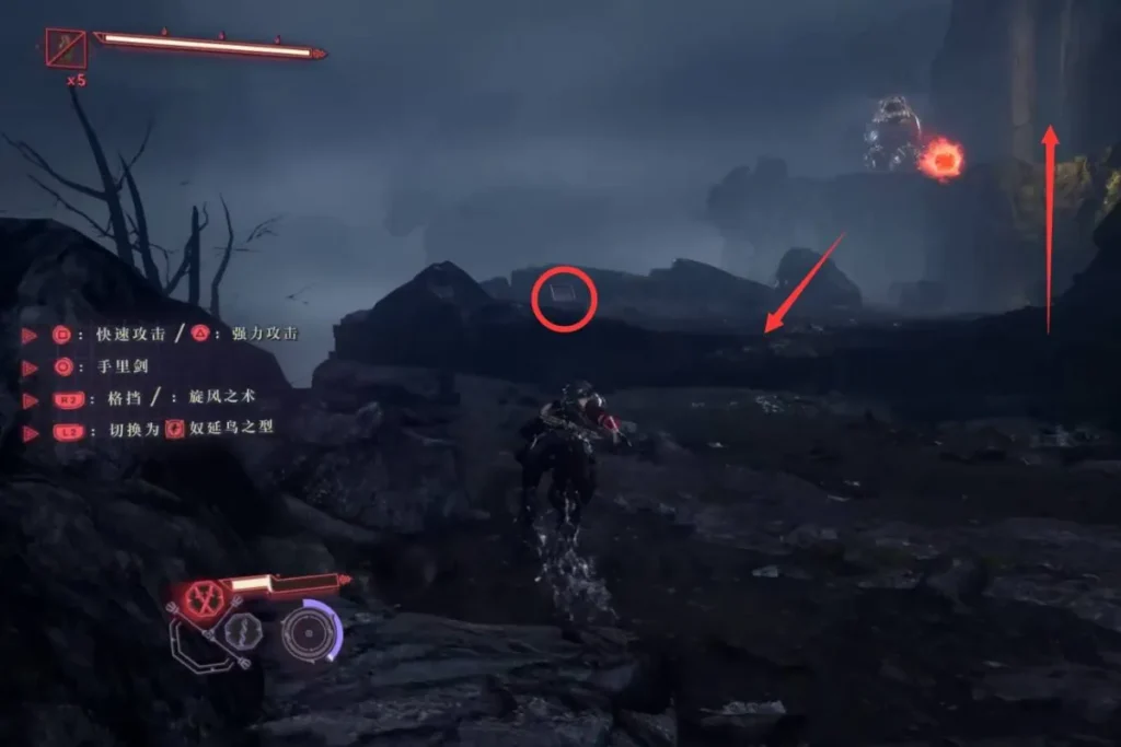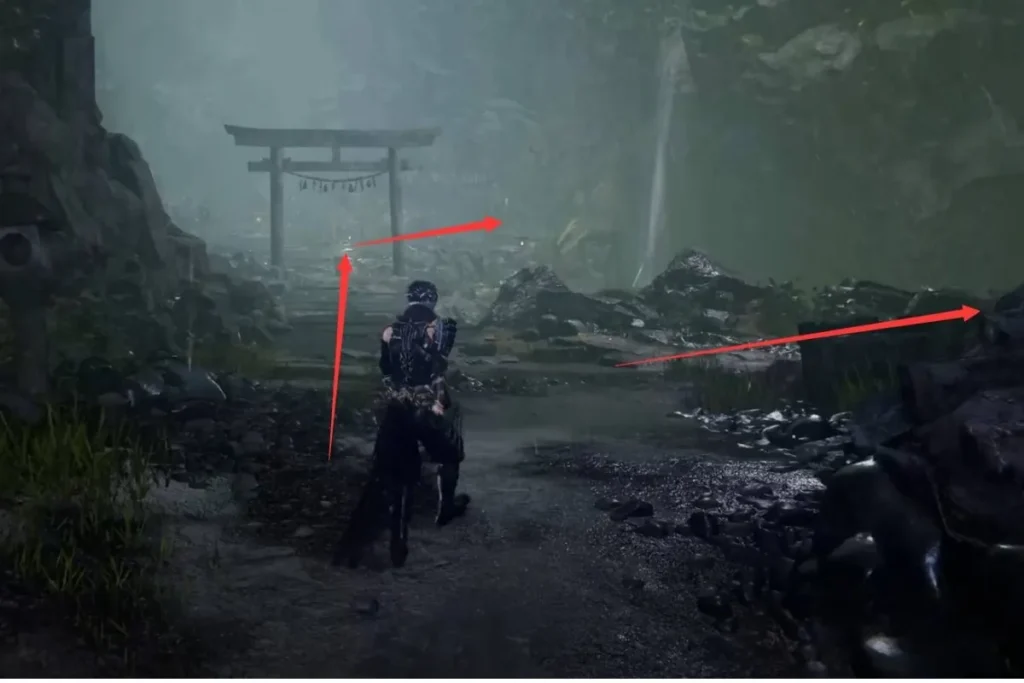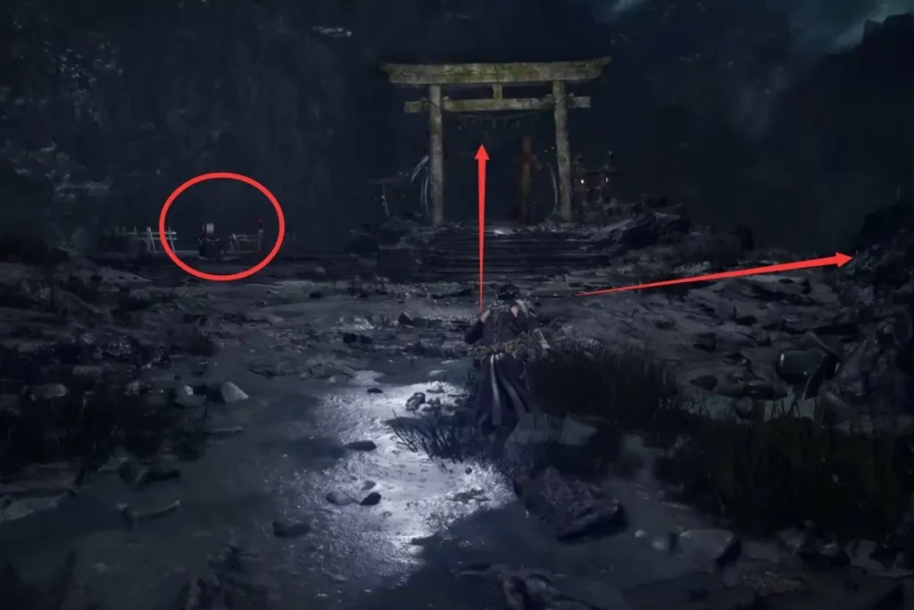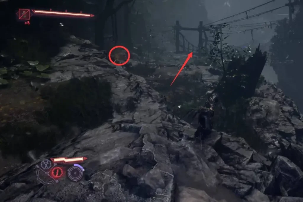 走上階梯後先不要用抓鉤往前,看向下方溝渠可以跳下去,底下有兩個寶箱以及一處【煉獄】可收集。