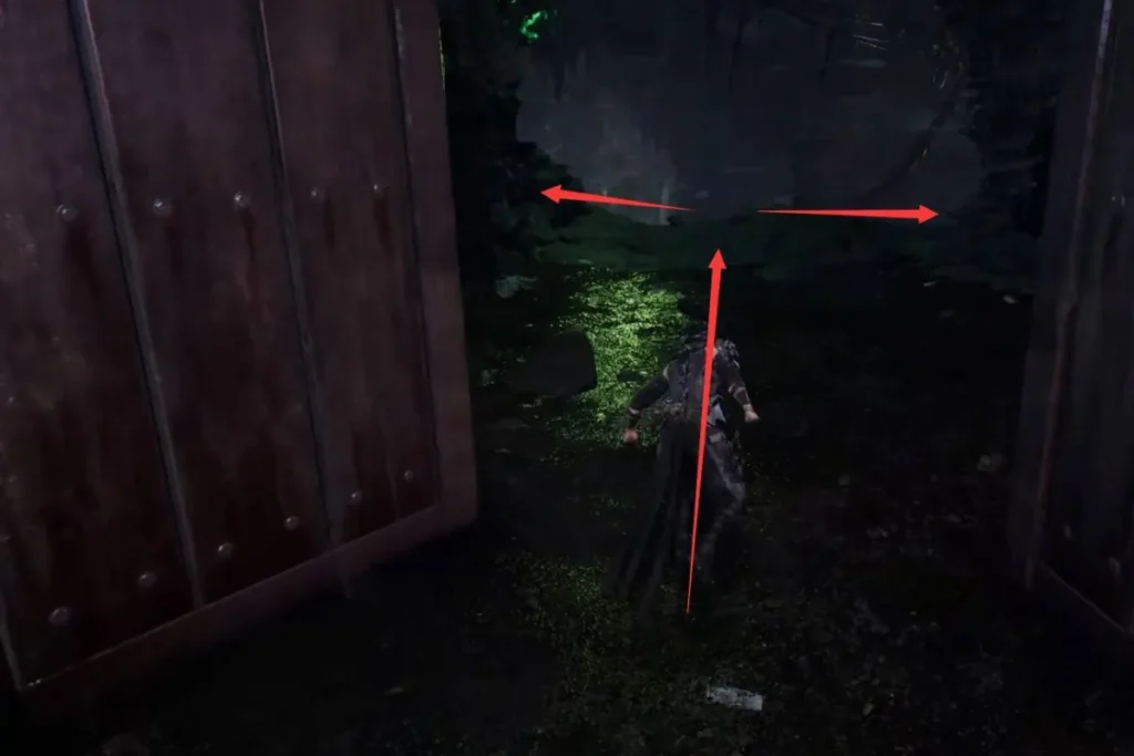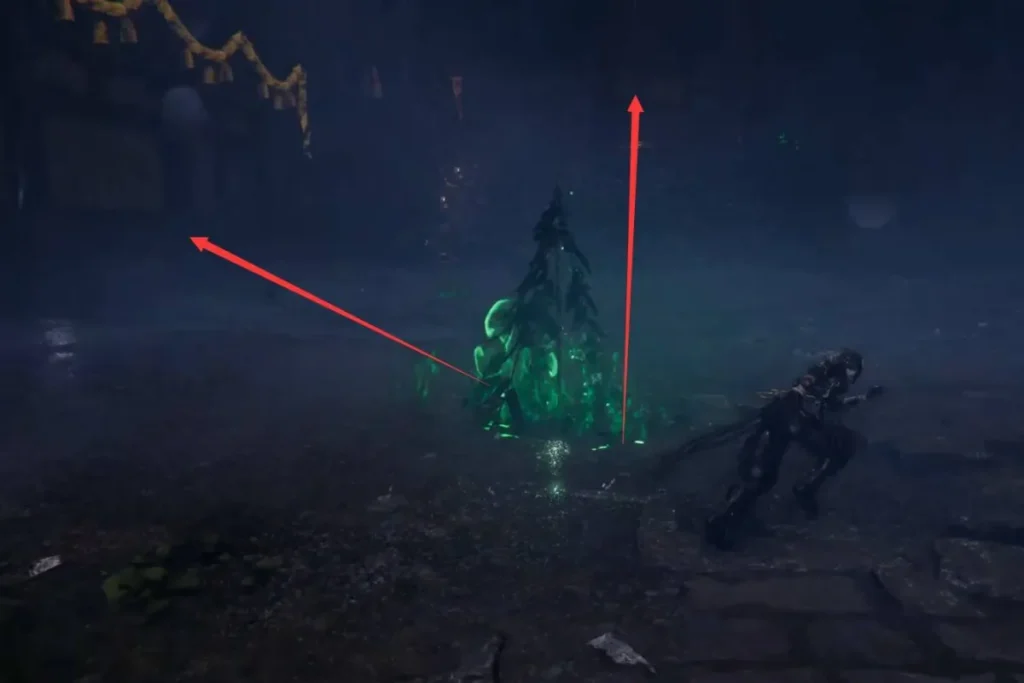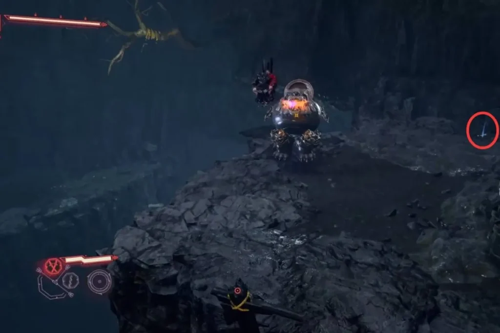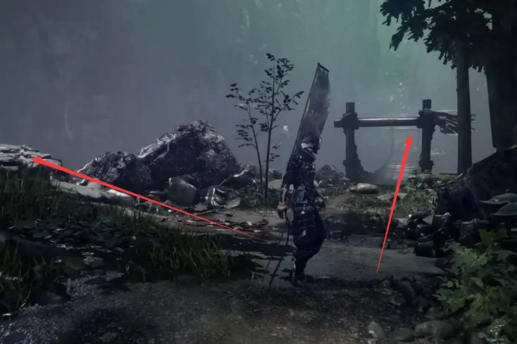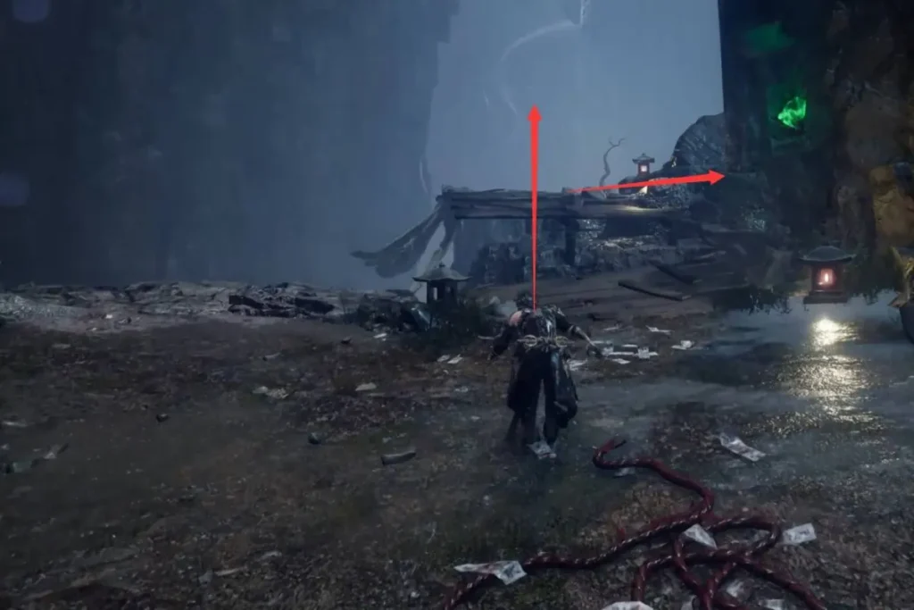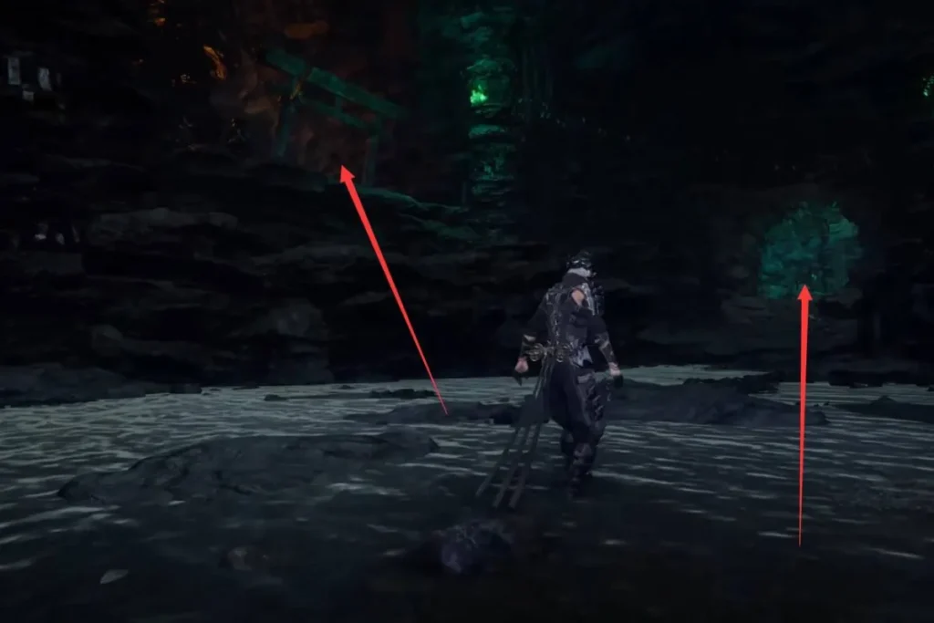 走上階梯後先不要用抓鉤往前,看向下方溝渠可以跳下去,底下有兩個寶箱以及一處【煉獄】可收集。