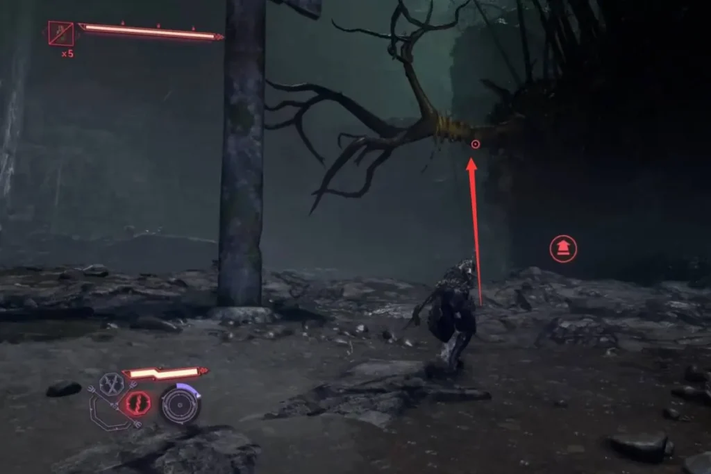 利用抓鉤勾住樹枝繼續往前,可取得兩個寶箱,再往前會繞回到先前的山洞入口。