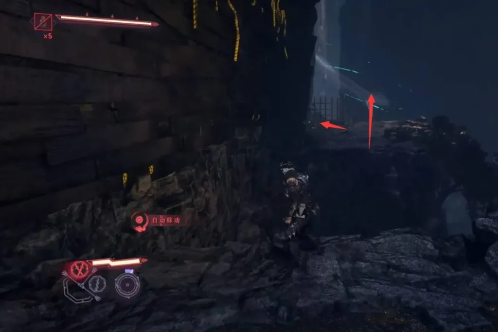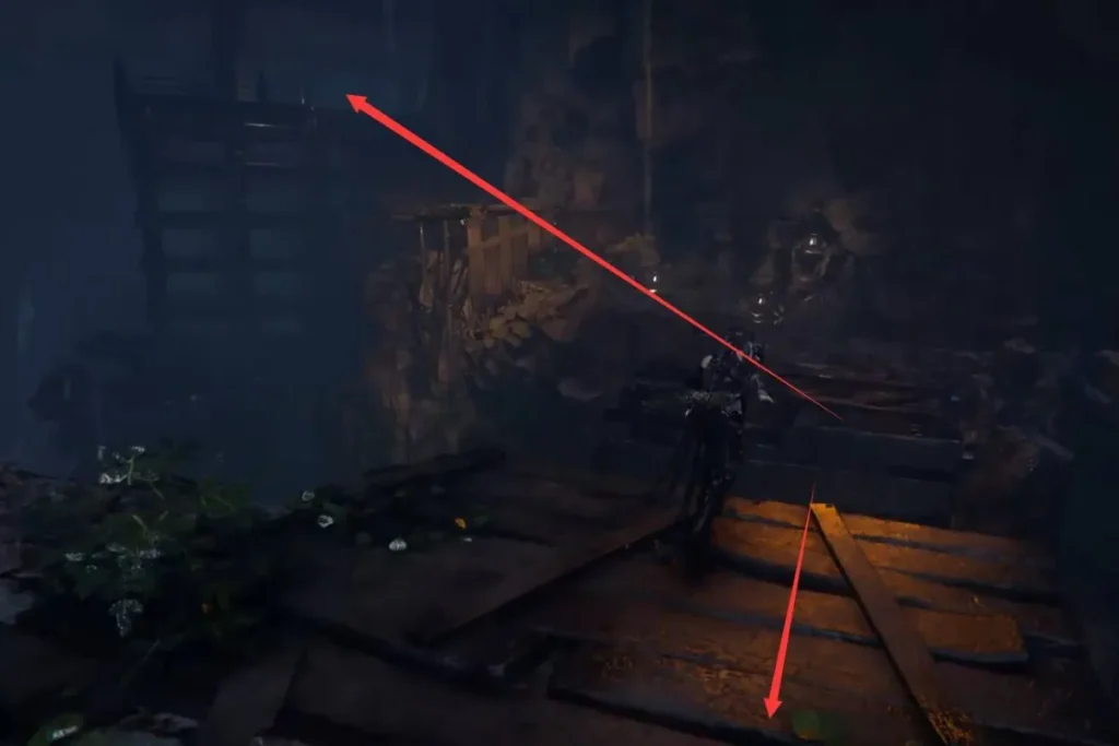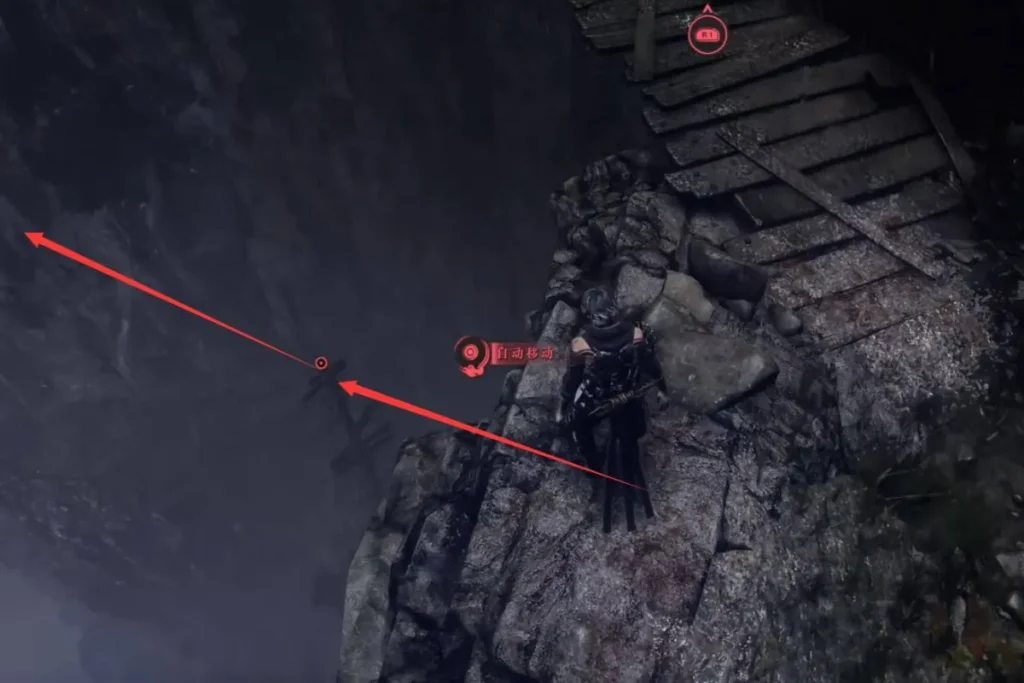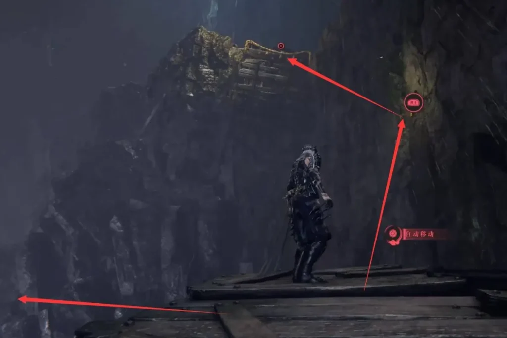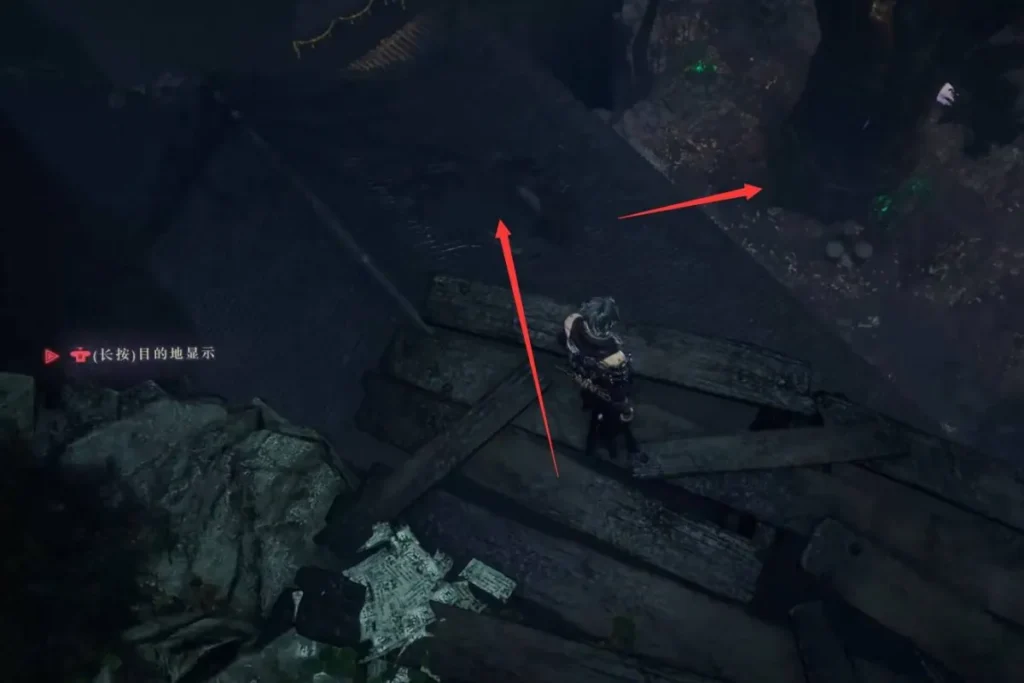 走下長階梯,消滅敵人後前往高處進行蹬牆跑。穿過小門後可取得一個寶箱,接著將擋路的木板直接砍碎,便能抵達懸崖邊。