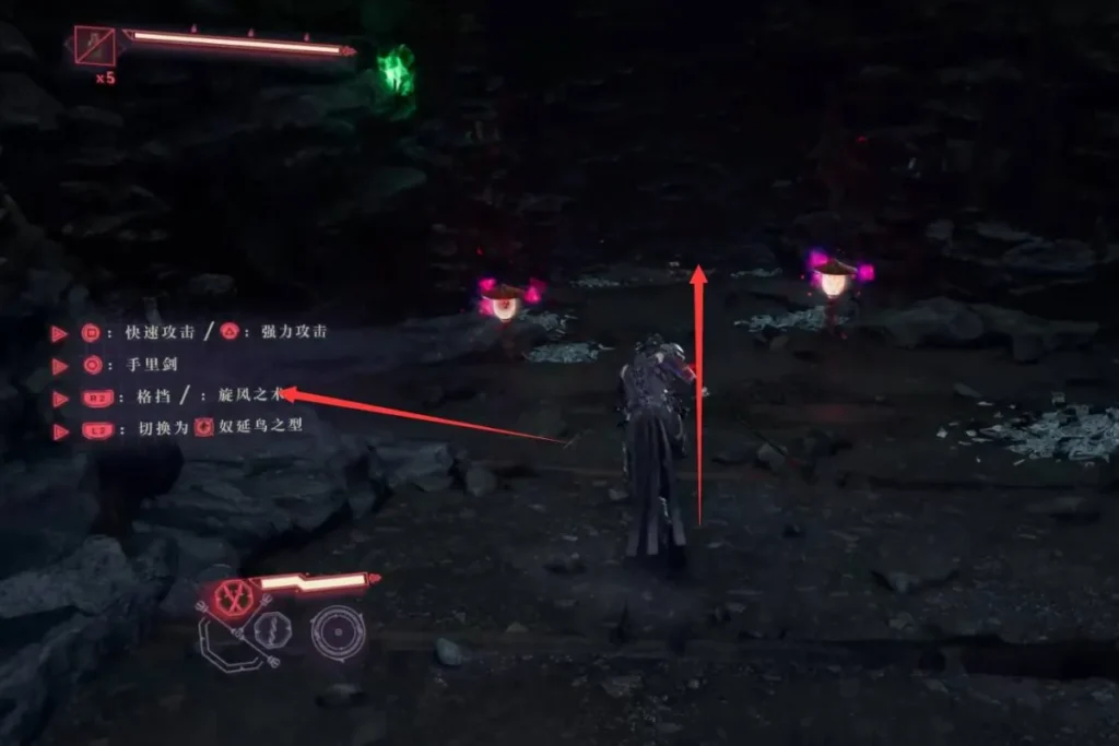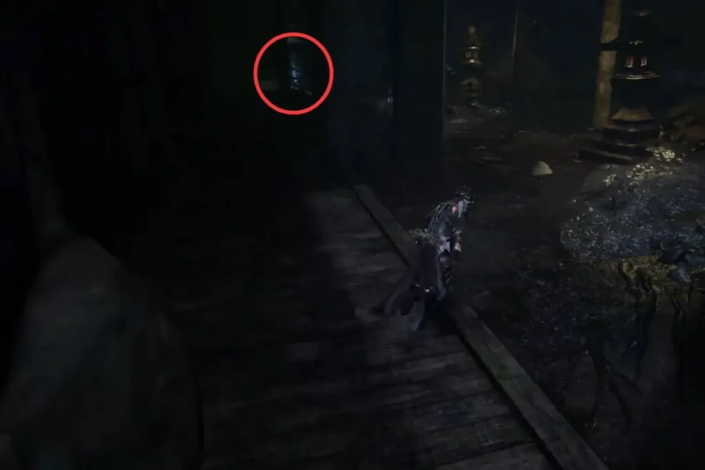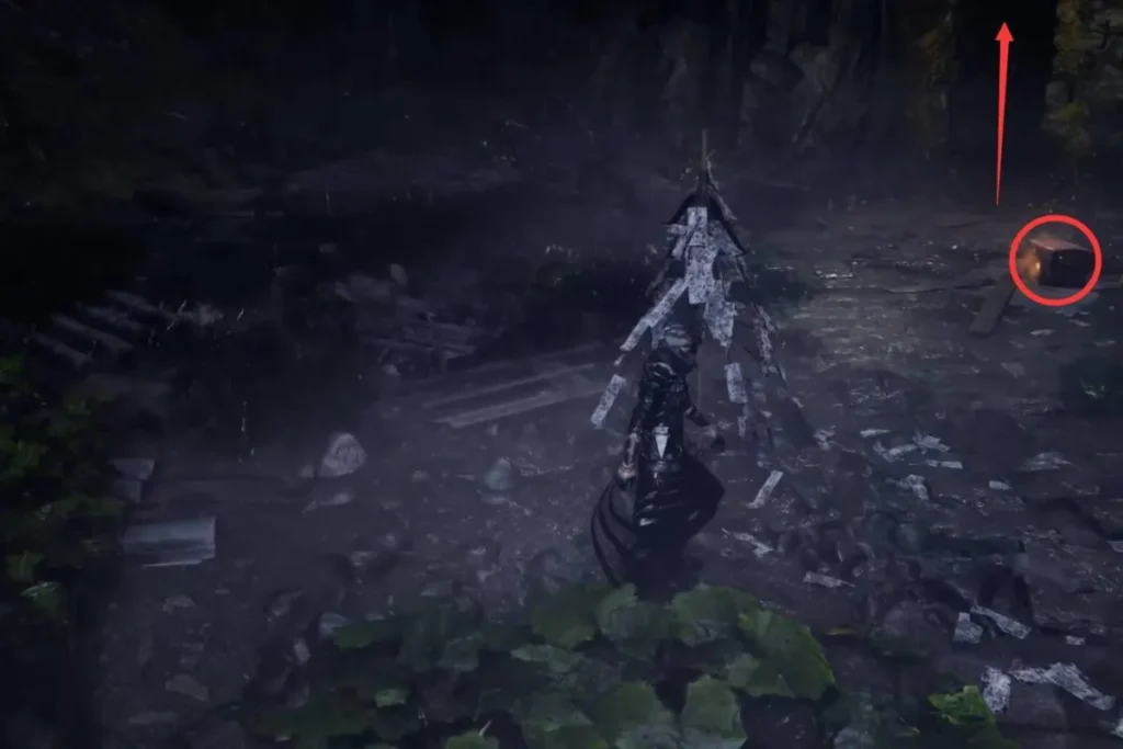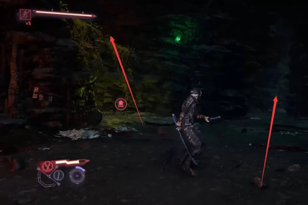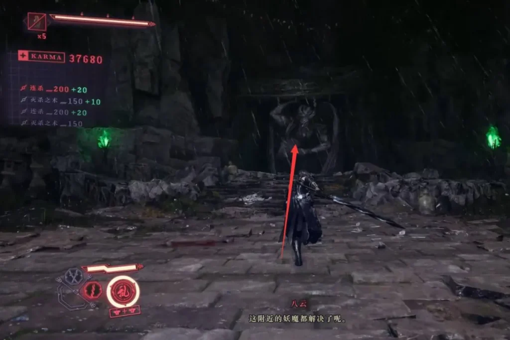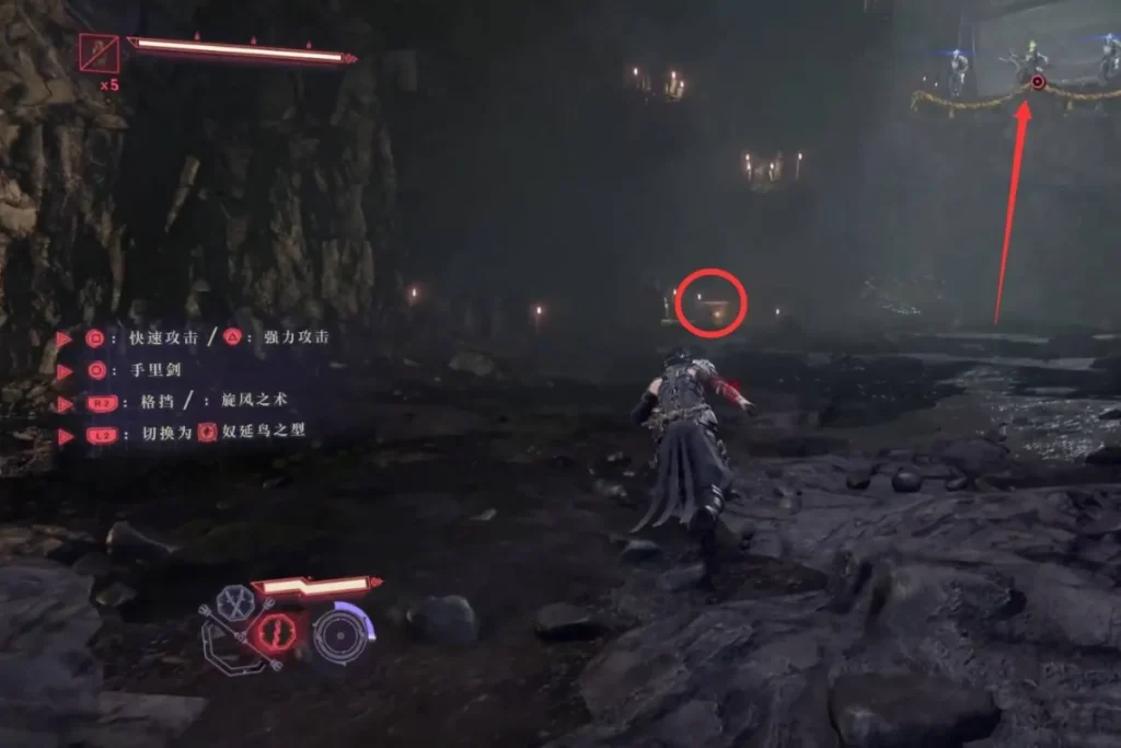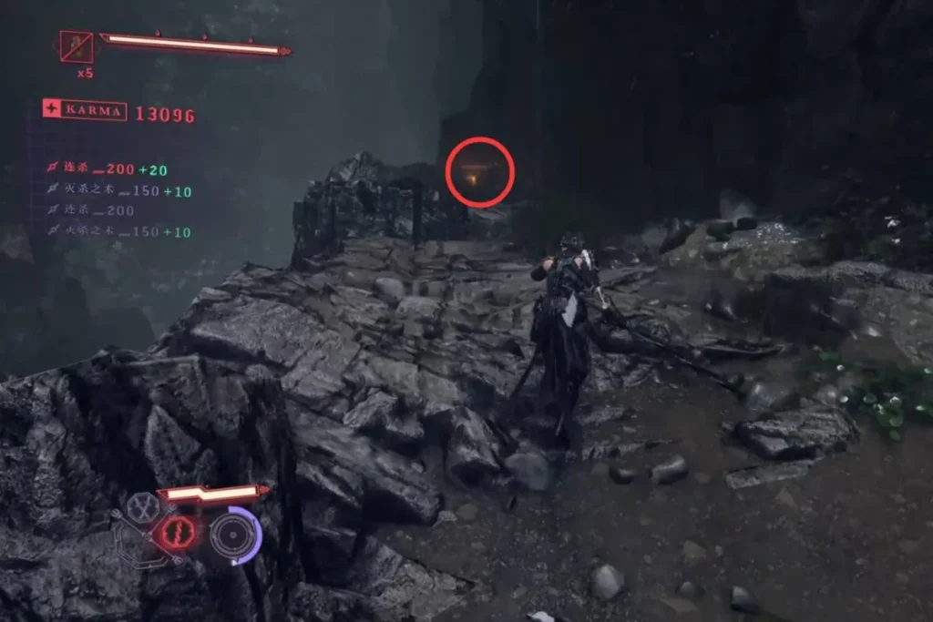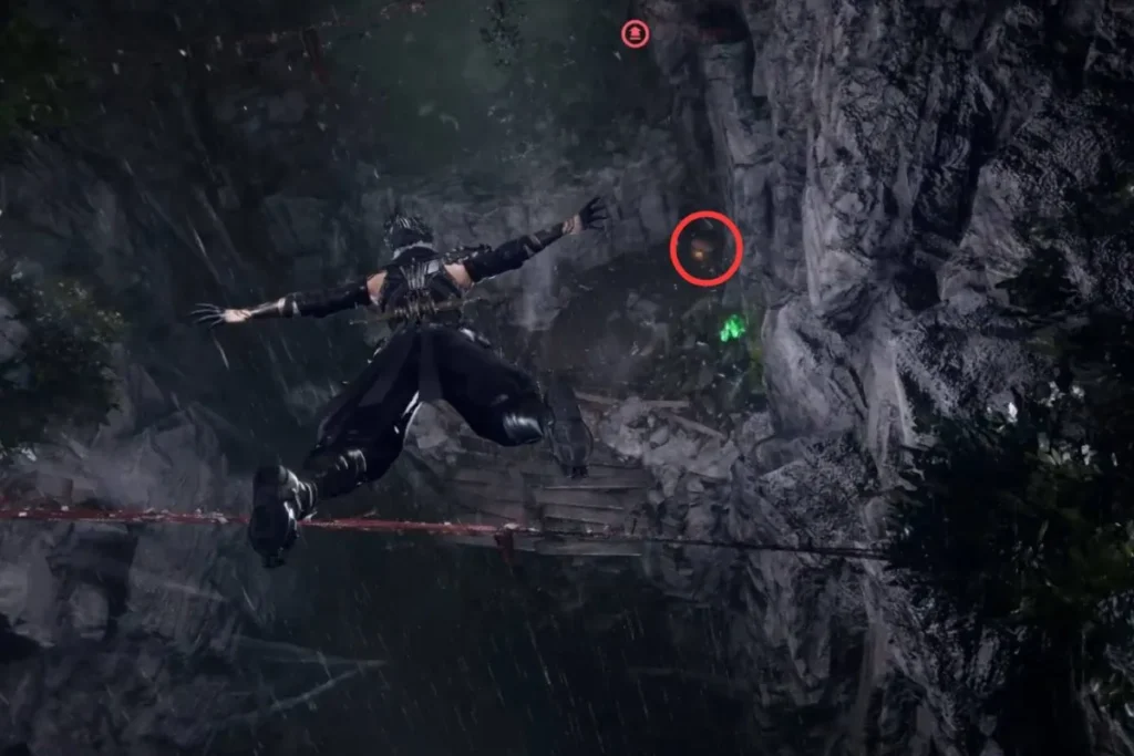 走上階梯後會看到一條懸掛的繩子,持續攻擊繩子後會刷出多波敵人。全部消滅後可以取得兩個寶箱,其中一個包含【飾品:赤玉往生煙管】。