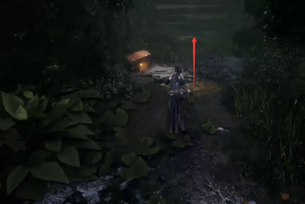 走過竹林小道後,面前的平台上有一個寶箱,左側也有另一個寶箱可取得,之後再從右邊的道路繼續前進。