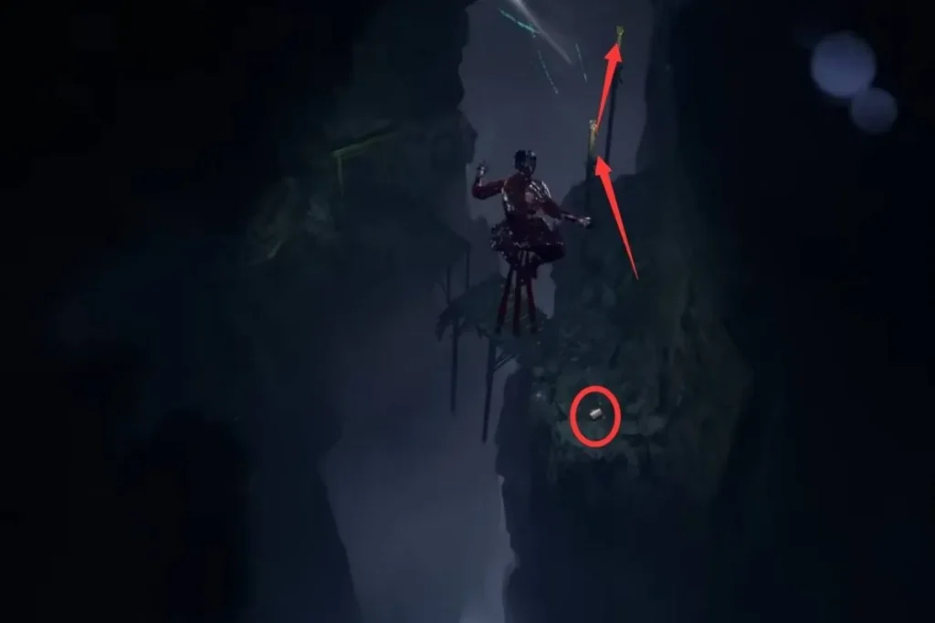 使用抓鉤跳過山崖後,往前走到底可以取得一個寶箱。拿完後折返,前往左側並往上跳繼續前進。