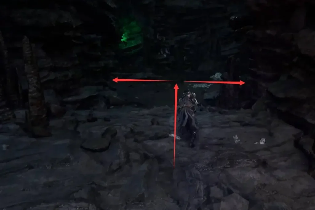 跑酷跳過懸崖後,走上階梯會看到前方有綠色火光,右側有一個寶箱可先取得,之後回頭往左邊前進,進入山洞。