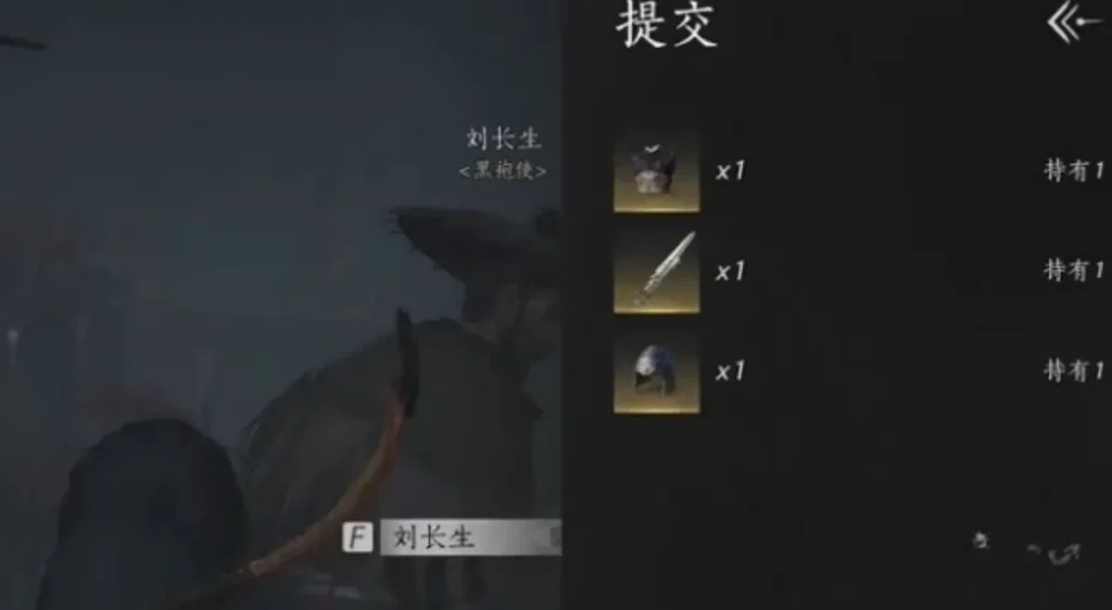 - 收集完三件道具後,回去交給任務 NPC 黑袍使(劉長生)。